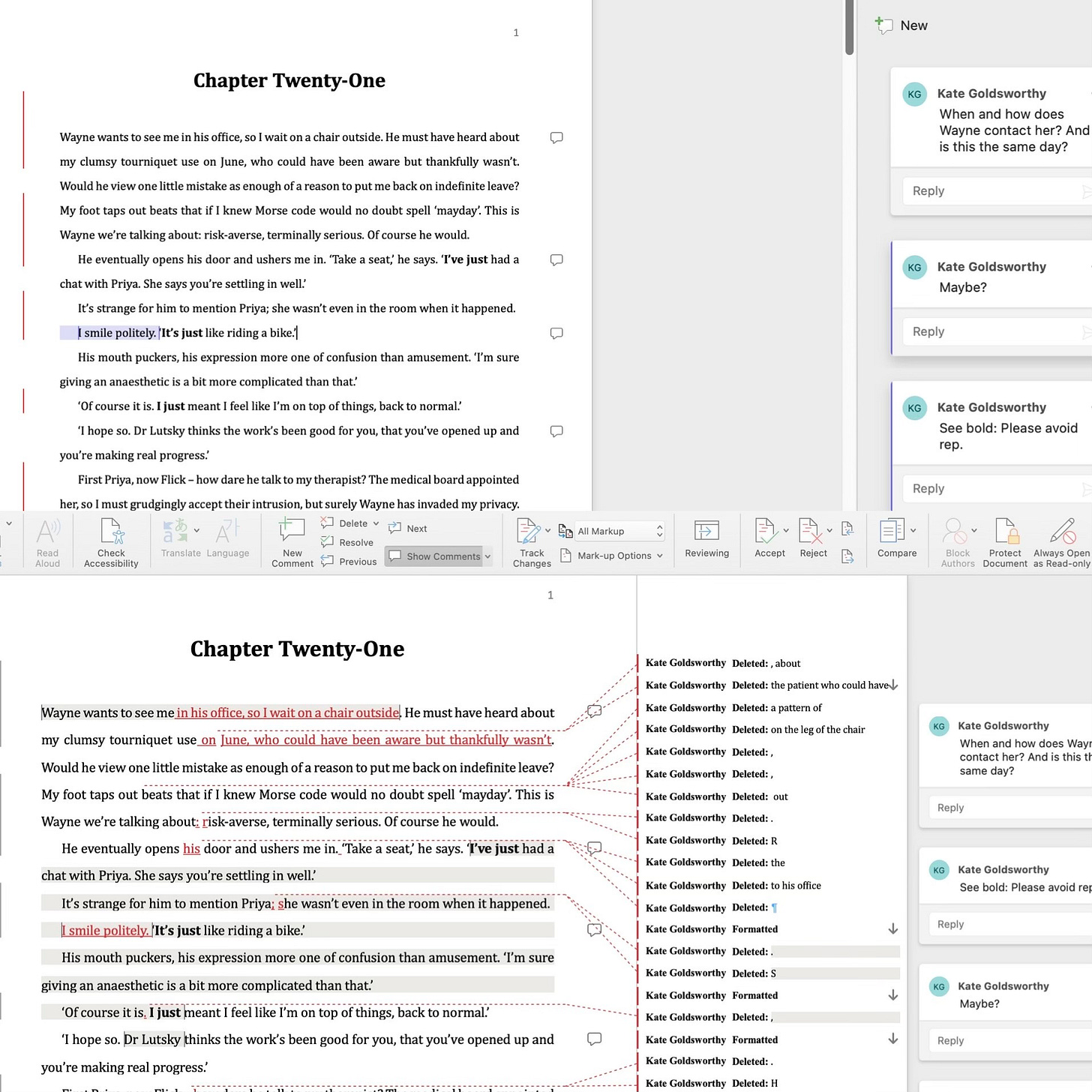 Read the comments in Simple Mark-up before subjecting yourself to All Mark-up. My editor gave me this advice when I reached out to her as per point two, but I didn’t follow it until Chapter Twenty, when a timeline error made the edits more complicated (or heavy in editor-speak) than most. I realised, as I rewrote part of the scene to fix the glaring error which had crept in during the structural edit, that it would have been a waste of time to accept the editor’s suggested punctuation changes on a paragraph I would soon delete. The moral of the story? Listen to your editor – which doesn’t mean you must agree with everything they suggest.
